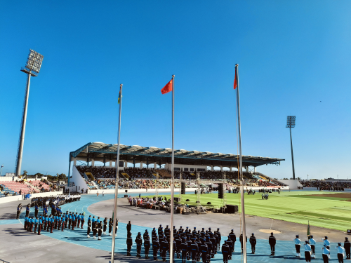 中科友谊之花在阅兵场上昂扬绽放,50年深耕双边关系的丰硕成果在这一天得到集中展现。此次阅兵活动在中国援建的马鲁基尼体育场举行,场外“中国援助”标识熠熠生辉,场内五星红旗光彩夺目,观众席上“中科友谊万岁”横幅随风飘扬,阅兵场上中国方队威武雄壮。解放军参阅方队通过观礼台时,科方特意安排主持人用中文解说双边关系和合作成果:“马鲁基尼体育场、人民宫、中科友谊医院……这些标志性项目不仅改善了当地民生,更为科摩罗经济社会发展注入了强劲动力。”阿扎利总统在致辞中特别指出,“让人倍感幸运的是,今年不仅是科独立50周年,也是中国和科摩罗建交50周年,感谢所有支持科独立的国家,感谢中国。”两国的友谊不止在政府之间,更是深深根植于两国民众之中。在使馆外交官手持中国国旗走过观众席时,民众纷纷鼓掌欢迎,“你好”的热情问候此起彼伏,工作人员为所有中国同胞通行提供便利,言称“只要是中国人都欢迎进场观礼”。